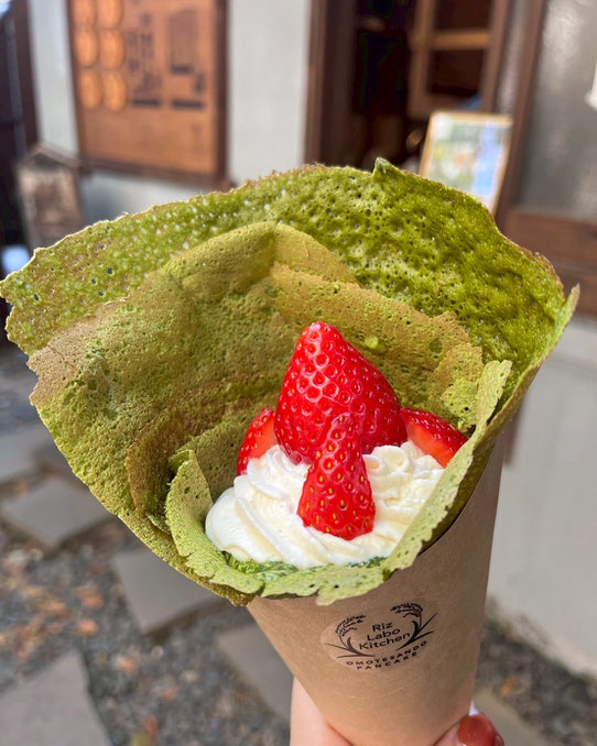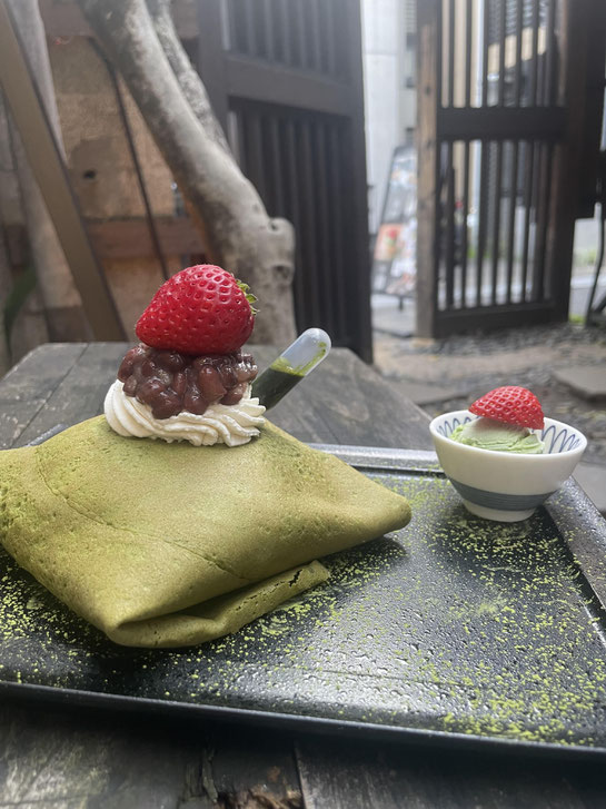 京都宇治の播磨園の有機抹茶を贅沢に使用し、豊洲市場からの新鮮ないちご。抹茶の豆乳カスタード (アイスは+100円)